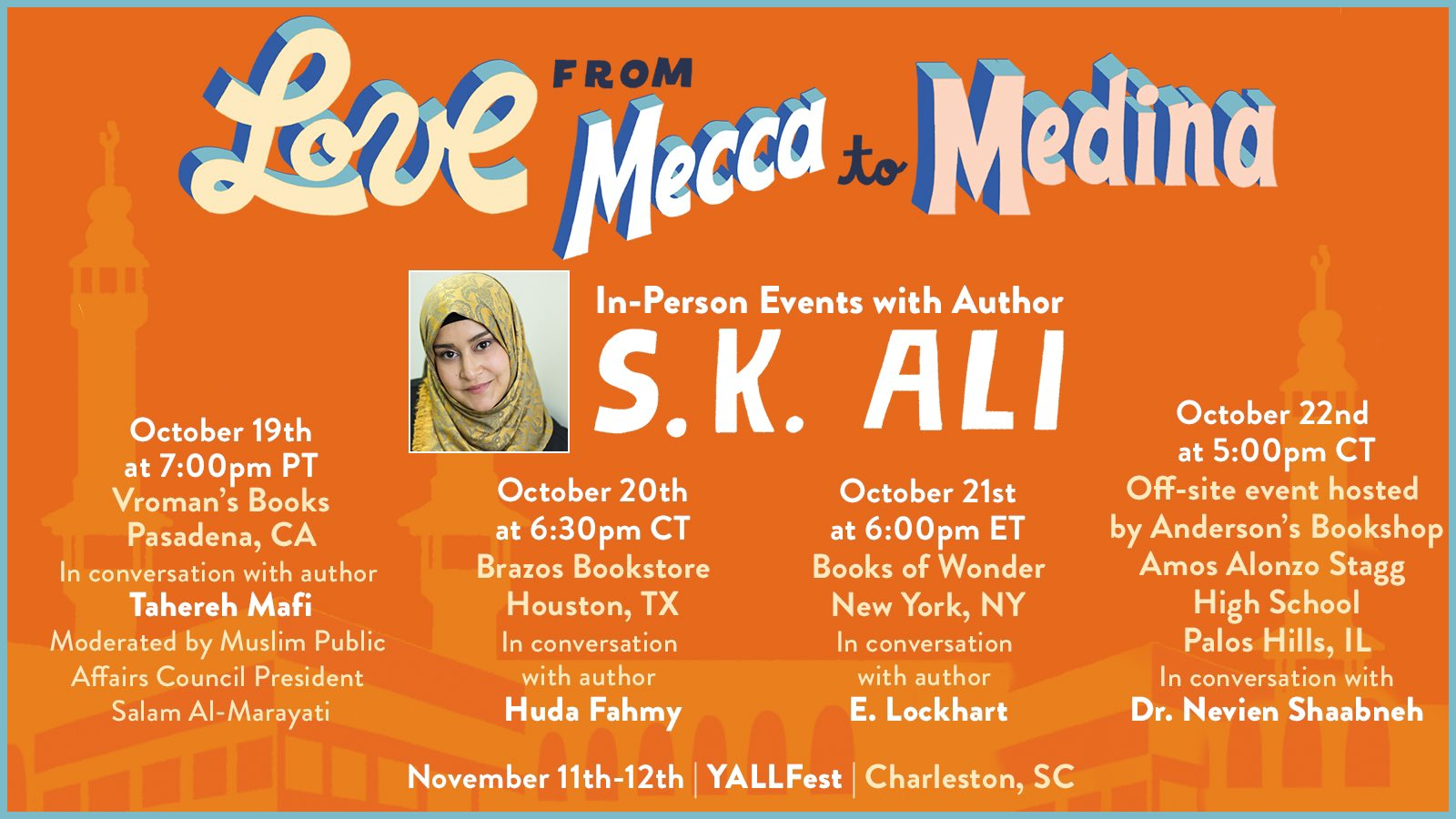 “S. K. Ali is the NYT bestselling and award-winning author of several books. Her debut novel, Saints and Misfits was the winner of the 2018 APALA Honor award, the 2017 Middle East Book Honor Award, and a 2018 William C. Morris Award finalist. Her widely acclaimed second novel, LOVE FROM A TO Z, a story about finding love in the time of Islamophobia, was an Entertainment Weekly Top Ten Young Adult Book of 2019 and a Goodreads Choice Awards finalist . It was also the first teen novel chosen for NBC Today Show’s Read with Jenna Book Club. The sequel to Saints and Misfits, Misfit in Love, was a People magazine best book of summer 2021. Her newest YA novel, LOVE FROM MECCA TO MEDINA releases Oct. 18, 2022. She also has a picture book co-authored with Team USA Olympic Medalist, Ibtihaj Muhammad, THE PROUDEST BLUE, which debuted on the New York Times bestseller list. Her Middle Grade novels include the critically acclaimed anthology ONCE UPON AN EID co-edited with Aisha Saeed, and the soon-to-be-released GROUNDED (Spring, 2023). She lives in Toronto with her family, which includes a very vocal cat named Yeti and his new pal, Mochi.” Find her on twitter at https://twitter.com/SajidahWrites, on instagram at https://www.instagram.com/skalibooks/ , on TikTok at https://www.tiktok.com/@skalibooks