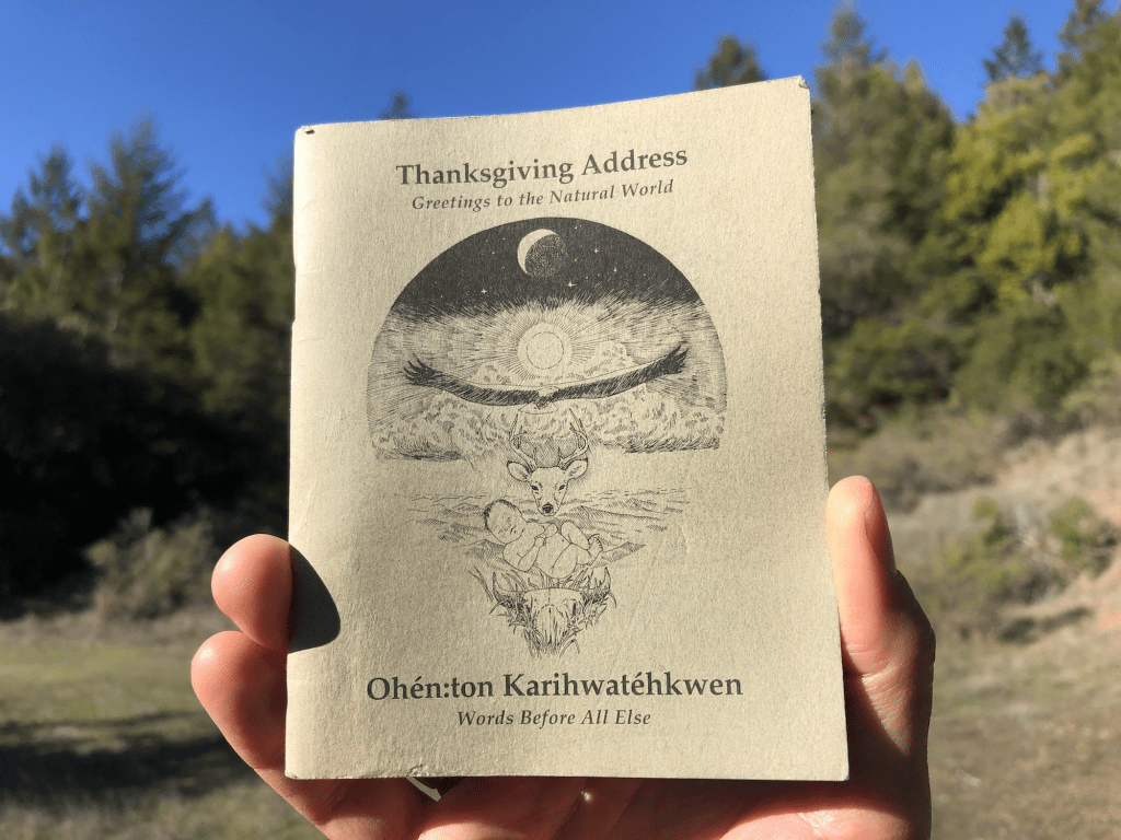 “I’m told that the Thanksgiving Address is at heart an invocation of gratitude, but it is also a material, scientific inventory of the natural world. Another name for the oration is Greetings and Thanks to the Natural World. As it goes forward, each element of the ecosystem is named in its turn, along with its function. It is a lesson in Native science.”
