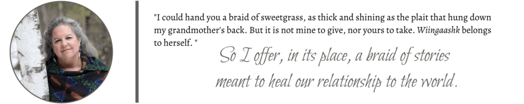 › The first thing Braiding Sweetgrass did for me was awaken a need to learn more about the plants around me. Called sweetgrass due to its vanilla scent, in many Native American languages, it is called Wiingaashk (pronunciation). A sacred plant that can purify and cleanse the air and environment, Indigenous stories say sweetgrass was the first plant to grow on earth and is the hair of Mother Earth. Braiding the sweetgrass makes it strong and it is used for smudging or sometimes hung in doorways for protection. It has historical significance and medicinal properties.